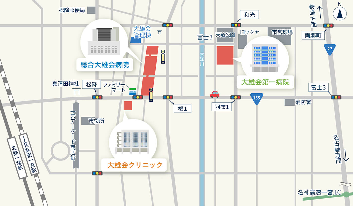 周辺地図 総合大雄会病院・麻酔科 〒491-8551 愛知県一宮市桜1-9-9 TEL.0586-72-1211(代) アクセス 電車の場合 名鉄名古屋本線・名鉄一宮駅下車徒歩15分 JR東海道本線・尾張一宮駅下車徒歩15分 バスの場合 名鉄一宮駅バスターミナル 4番のりばから 江南駅、江南団地行き乗車、「総合大雄会病院前」停下車すぐ 自動車の場合 名神・一宮インターチェンジから10分 名古屋高速・一宮東インターチェンジから7分 病院公式ホームページ 交通のご案内へ